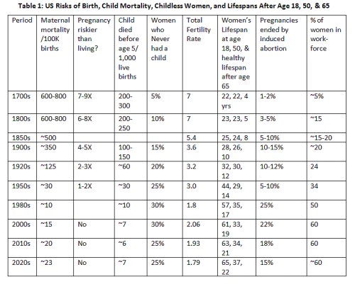 of women dying in childbirth had dropped to about four to five times higher than the general mortality for women their age, and about 15% of women never had a child. By the 2000s, childbirth was no more dangerous than other risks of living, a quarter of women never bore a child, and only about 7 of every 1,000 kids died before age 5. The decline of the U.S. TFR is shown in Column 6. Column 7 shows the average number of years of life remaining for women at ages 18 and 50, and the number of healthy years of life remaining after age 65 (men’s average was always two to four years less at each age). Notice that in the 1700s, if a woman lived to age 18, she was about as apt to live 22 more years as a 50-year-old! By the 1950s, increasing lifespan was evident. AI likely estimated induced abortions from questionnaire studies in column 8, and – given the abortion pills’ growing availability and privacy of use – the decline reported is suspiciously low. In column 9, the steady growth of women entering the workforce can be seen to correlate with a longer lifespan, safer childbearing, and a declining birthrate. Table 1 makes clear that a healthy demographic does not require every woman to get pregnant, but many must have multiple children. As women acquired more wealth, responsibilities, and lifespan, their willingness to replenish community numbers declined.