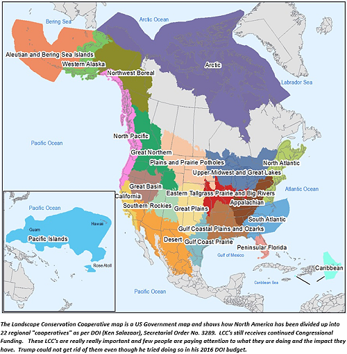Since the ” World Religion” has been in operation for over 300 years, not including the Islamic ” religion”, is it possible that a mis-reading of the tea leaves is possible. As an old 81 years and change, Military & Civilian analyst, in effect trust no one, as one might today rational – meantime I found this little tidbit, at the bottom of a Graphic noting the ongoing Regionalizing of the American Continent: The Landscape Conservation Cooperative map is a US Government map and shows how North America has been divided up into 22 regional “cooperatives” as per DOI (Ken Salazar), Secretarial Order No. 3289. LCCs still receives continued Congressional Funding. These LCCs are really really important and few people are paying attention to what they are doing and the impact they have. Trump could not get rid of them even though he tried doing so in his 2016 DOI budget.